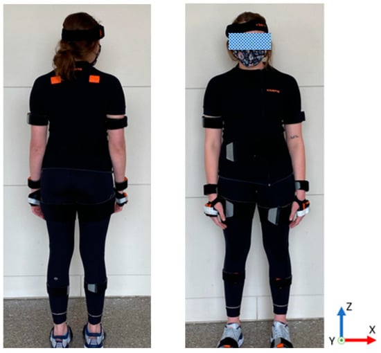 Motion capture technology is the gold standard for the collection of kinematic data [28] and was used for this study to correlate and validate the angle of the ankle to the pressure across the feet. A commercially proven motion capture system, Xsens, utilized seventeen inertial measurement units (IMUs) placed on the body to identify the body segment orientation and the angle of the joints, as shown in Figure 3. Upon placement of the IMU devices for the study, the sensors were calibrated with the participant standing in the N-pose (upright position, head forward, arms resting at sides), walking forward and returning as per the manufacturer’s recommendations. Following the collection of the movements, the data were processed in the Xsens motion capture software and then through Visual 3D with the joint angles calculated based on the orientation of the distal body segment to the proximal body segment. For the ankle, this was the orientation of the foot relative to the shank.