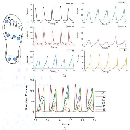 Right foot sensor output for walking: (a) pressure outputs of individual sensors; (b) combined sensor graph with a complete output of the insole.