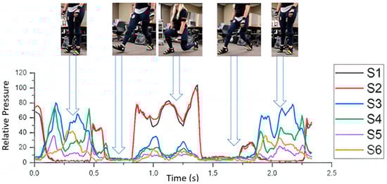 A squat, as defined in this study, started with the subject raising their heels off the ground to indicate the start of the motion. The subjects then entered a shallow squat position where the legs became parallel to the ground. The subjects then rose to a standing position and finished by raising their heels again to show the end of the motion. This movement was repeated a total of ten times per participant. The movement progression is illustrated below in Figure 5 with the accompanying sensor readout. As a participant progressed through the movement, S1 and S2 registered near zero then the sensor spiked to signal the start of the movement. As a squat progressed, a greater pressure was applied to the front of the foot, S3–S6. The squat then ended with S1 and S2 dropping to near zero, which signaled the end of the movement.