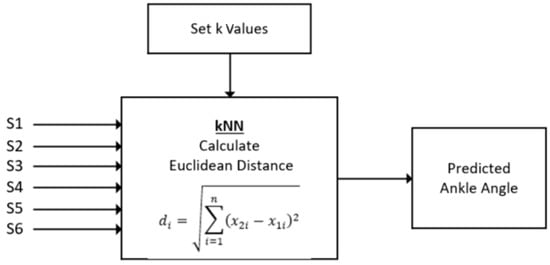 A nonparametric density classifier, a kNN, was used to predict the ankle angles. Figure 7 shows the flow diagram of the kNN whose input was the six sensor pressure data and output were the ankle angle predicted. All participant data were combined together and split into two datasets; 80% for training the surrogate model and 20% of the other remaining dataset for validation. The kNN was chosen using the MATLAB classification solver, which tests a skew of the classification-based algorithms and determines which one works based on the given dataset. In the design of the prototype, the kNN algorithms were computationally efficient and allowed for a rapid design. The model calculated the Euclidean distance between the points in the training dataset and the input points. Given a trained dataset and the distance, the kNN searched and found the k-closest points in the input dataset to the trained dataset. The decision for the classification of the input points was made based on the sum of the distances and the class provided that the closest distance was selected as the value predicted. The number of neighbors remained at 10 and the optimal value was determined where the highest accuracy was achieved. In our dataset, a 6-input data sheet containing all sensors was inserted in the kNN algorithm and the optimal 10 values were chosen using MATLAB. A classification-based model was chosen compared with a linear regression-based model because the angle data were reported with an integer level accuracy.