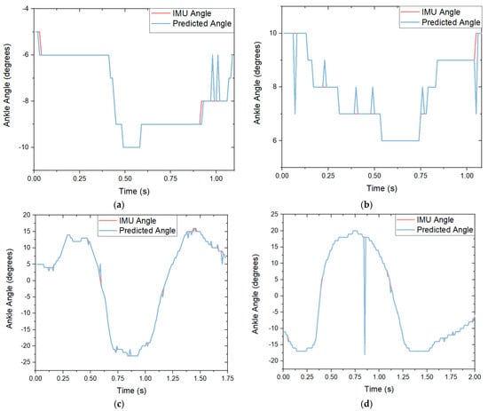 The Xsens-predicted angle compared with the algorithm-predicted ankle angle in the y-axis for each movement: (a) graph of a single squat movement on the left foot with an accuracy of 94.2%; (b) graph of a single squat movement on the right foot with an accuracy of 92.4%; (c) graph of a single right stoop movement on the left foot with an accuracy of 90.2%. (d) graph of a single left stoop movement on the right foot with an accuracy of 88.9%.