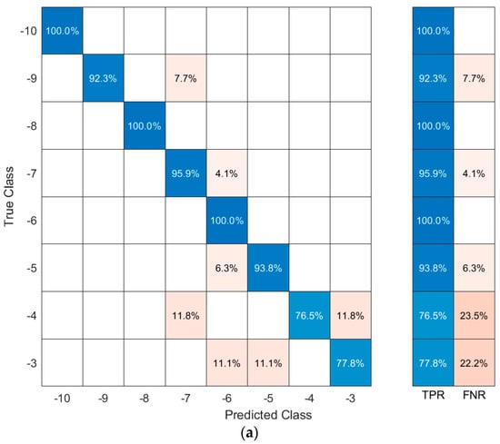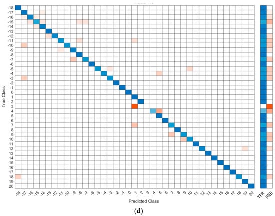 The machine learning code was broken up by movement: each movement was analyzed separately to minimize confusion between the movements. As with the graph, the squat was the most accurate movement when training the ankle angle when coupled with the k-nearest neighbor algorithm, returning an accuracy of 93.8%. This algorithm used the six FSRs as inputs to produce the output of the ankle angle. After the accuracy calculations were completed, a confusion matrix was made to determine how the machine learning accurately predicted the outcome. The true angle was located on the y-axis while the predicted angle was displayed on the x-axis. A perfect model would have had all predictions along the middle diagonal axis. The confusion matrix-generated movements created by the kNN classification algorithm are shown in Figure 9. Figure 9a contains the confusion matrix for the left stoop movement. Figure 9b shows the confusion matrix for the right stoop movement. Figure 9c displays the matrix for a right stoop on the left foot. Figure 9d shows the confusion matrix for the right foot in a left stoop. In the Figures below, the true positive rate (TPR) is the total percentage of positive predictions on the sample set of data given the angle regarded. The false negative rate (FNR) is the total percentage of the incorrect predictions on the sample set of data.
