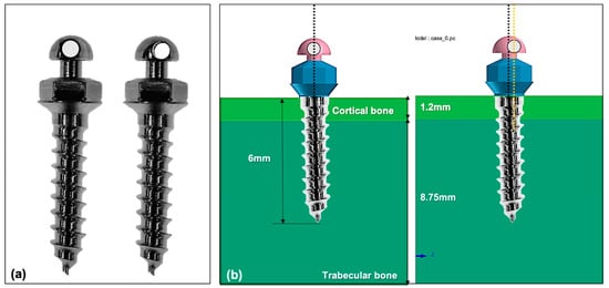 Two types of miniscrews based on the position of a hole in the head part: (a) the left one has a hole in the middle of the miniscrew’s head part (centric hole group), and the right one has a hole out of center of the miniscrew’s head part (eccentric hole group); (b) in the constructed model for this study, the two types of miniscrews were assumed to be placed totally into the alveolar bone. Thickness of the cortical bone was modeled at 1.2 mm, and the trabecular bone was thick enough to accept the whole length of the miniscrews. The left model is a miniscrew of the centric hole group and the right one is a miniscrew of the eccentric hole group.
