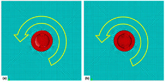 Direction of rotation applied to the miniscrew model: (a) on the top view of the miniscrew head part in the centric hole group, counterclockwise rotation was applied with the long axis of the miniscrew as a center of rotation; (b) same rotational direction (counterclockwise rotation) was applied to a miniscrew in the eccentric hole group.