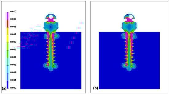 Distribution of Von-Mises stress under the condition of 1° counter-clockwise rotation of the miniscrew: (a) centric hole group; (b) eccentric hole group. Both groups showed relatively even distribution of Von-Mises stress.