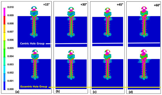 Distribution of Von-Mises stress under the condition of 1° counter-clockwise rotation of the miniscrew placed with various positive angles on the alveolar bone surface: (a) Von-Mises stress distribution of the miniscrew at +15° angulation in centric and eccentric hole groups; (b) Von-Mises stress distribution of the miniscrew at +30° angulation in centric and eccentric hole groups; (c) Von-Mises stress distribution of the miniscrew at +45° angulation in centric and eccentric hole groups; (d) Von-Mises stress distribution of the miniscrew at +60° angulation in centric and eccentric hole groups. In both groups, more stress was concentrated on the upper 1/3 as the angle increased.