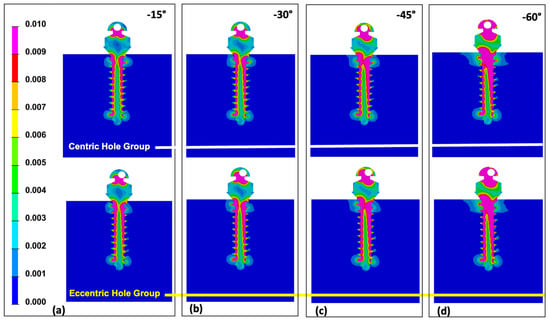 Distribution of maximum Von-Mises stress under the condition of 1° counter-clockwise rotation of the miniscrew placed with various negative angles on the alveolar bone surface: (a) Von-Mises stress distribution of the miniscrew at −15° angulation in centric and eccentric hole groups; (b) Von-Mises stress distribution of the miniscrew at −30° angulation in centric and eccentric hole groups; (c) Von-Mises stress distribution of the miniscrew at −45° angulation in centric and eccentric hole groups; (d) Von-Mises stress distribution of the miniscrew at −60° angulation in centric and eccentric hole groups. In both groups, more stress was concentrated on the upper 1/3 as the angle increased, and the stress distribution tendency was opposite to the result of the miniscrews implanted at positive angles.