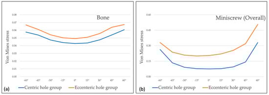 Von-Mises stress under 1° of counter-clockwise rotation at the alveolar bone and miniscrew at various angles: (a) Von-mises stress at the alveolar bone showing the higher stress in the centric hole group; (b) Von-Mises stress at the whole miniscrew showing the higher stress in the centric hole group and at positive angles.