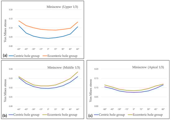 Maximum Von-Mises stress under 1° of counter-clockwise rotation at each part of the miniscrew: (a) Von-Mises stress at the upper 1/3 of the miniscrew showing relatively high value in the eccentric hole group and in the negative angles; (b) Von-Mises stress at the middle 1/3 of the miniscrew; (c) Von-Mises stress at the apical 1/3 of the miniscrew.