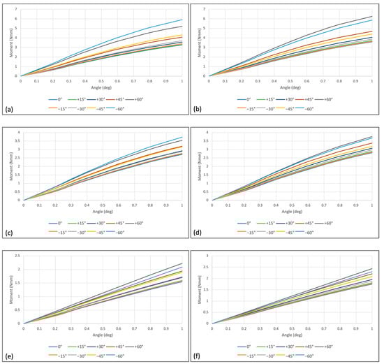 Moment required to unwind the miniscrew for 1° in counter-clockwise direction in centrical and eccentric hole groups: (a) overall moment in the centric hole group; (b) overall moment in the eccentric hole group; (c) moment at the cortical bone in the centric hole group; (d) moment at the cortical bone in the eccentric hole group; (e) moment at the trabecular bone in the centric hole group; (f) moment at the trabecular bone in the eccentric hole group.