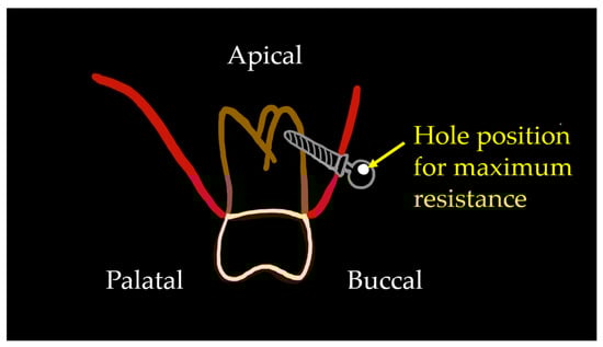 Suggestion of an ideal head hole position for maximum resistance to counter-clockwise rotational force. When the miniscrew tip directed the apical side with an angulation to the alveolar bone surface, the hole positioned on the upper (apical) side of the head would generate the maximum resistance to the rotational force.
