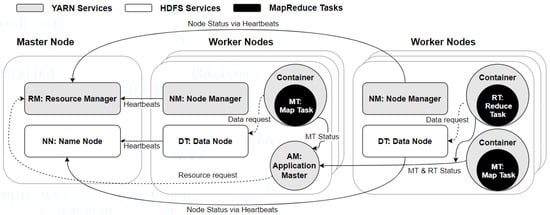 In this work, we used Apache Hadoop 2.9.2 (https://hadoop.apache.org/docs/r2.9.2/ (accessed on 3 May 2021)), which is the stable implementation of MapReduce that has adopted as the latest generation of MapReduce with YARN framework []. Hadoop MapReduce is designed based on the centralised architecture in which one node stands as the master node and other nodes are workers. The basic components of Hadoop MapReduce implementation are HDFS, YARN and MapReduce, as presented in Figure 1. First, HDFS [] splits the original dataset into data blocks and distributes them amongst its distributed file system that is managed by DN services. The size, replication and distribution of the blocks are handled by the master node of HDFS called NN. Then, YARN is also a centralised framework responsible for workload scheduling and resource management. YARN operates RM and Scheduler on the master node and NM, AM, and Containers on the worker nodes. RM along with the Scheduler maintains the resource scheduling and monitoring of worker nodes. RM launches NM on each worker node to offer a collection of physical compute resources such as (memory and CPU) in the form of containers for handling MapReduce applications. NM is also liable for sending heartbeat messages to RM to report the worker nodes’ liveness.