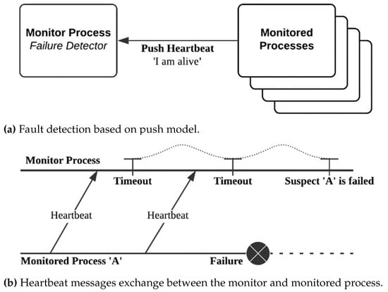 Fault detection is the first building block of a fault-tolerant framework that desires to detect faults as soon as they occur []. Hadoop MapReduce uses heartbeat monitoring based on the push model as a default approach. As illustrated in Figure 2a, all the monitored processes periodically send heartbeat messages at a specific timeout frequency to the monitor process. The absence of heartbeats from a given process beyond the specified timeout value indicates that the process is failed, as shown in Figure 2b. The heartbeat timeouts in Hadoop MapReduce are defined as configurable parameters [], discussed in Section 4.