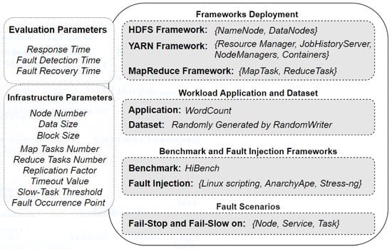 To date, experimental studies on the fault-tolerance issues of Hadoop MapReduce have been scarce, as seen in [,,]. Meanwhile, these studies only used the old version of Hadoop that which was not incorporated with the YARN framework, making their experimental results not up to date. Furthermore, the studies have not provided insights on the infrastructure parameters that affect the tolerance conditions under faults and failures. To the best of our knowledge, this is the first research effort that provides an in-depth analysis of the impact of node, service, and task faults, including two main conditions: fail-stop and fail-slow on Hadoop MapReduce response time. This research also investigates the priority of fault penalties and the relationship between fault detection and recovery techniques under various fault circumstances to be considered when designing a fault-tolerance solution. The purpose of this analysis is to address the following research questions: