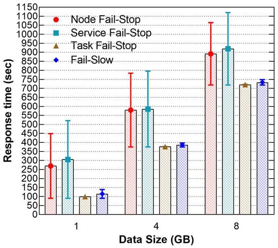 Then, the entire node was forcibly terminated from the cluster, including its active services and tasks (NM, DN, MT, or RT) at runtime to evaluate node fail-stop. The loss of a node leads to network disconnection where the input data provided by HDFS became unreachable. Thus, the progress rate of the running tasks stopped at the exact moment when the failure occurred. Thereafter, the scheduler detected the impacted tasks and restarted them on another healthy node. Therefore, the response time penalties for node fail-stop are slightly lower than the service fail-stop because the RM depends on the successive heartbeats (by default 600 s) to be received from the failed node to finish the job, and the scheduler had already re-executed the impacted tasks before the heartbeat timeout expired. Furthermore, task fail-stop and fail-slow incurred the lowest penalties in all the cases because Hadoop scheduler speculates the impacted tasks on another node once it detected they are terminated, or their progress rates are lower than the other active tasks without relying on the node expiry timeout.