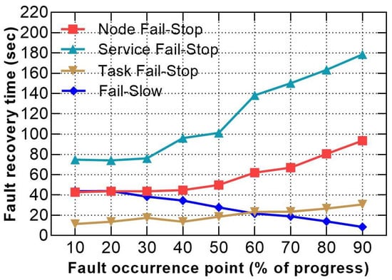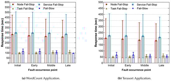 Figure 7 compares the injected faults at various occurrence points at runtime. Furthermore, it shows the response time differences between WordCount and Terasort applications when faults accumulated initially, and at the early, middle, and late points of the job lifetime, as recorded in Figure 7a,b. The tolerance time for the node and service fail-stop slightly decreased when they occur late because both depend on the master node to wait for the next heartbeat cycle to detect them and start the recovery actions. Since the fault-free job for both WordCount and Terasort had only one timeout cycle, faults at the late point of the timeout period required a shorter time to complete the cycle. On the other hand, task fail-stop penalties increased by 18.17%, 34.27% for the late point compared to the initial because the entire tasks waited for the re-execution of the faulty task from the beginning. However, the fail-slow response time penalties decreased at the late points by 25.4%, 23.94%, because the impacted node only suffered slow performance for a few seconds before it was completed without triggering the speculative task. The results also show no significant difference in terms of fault-tolerance when using various MapReduce applications because the current fault-tolerance method does not consider the programming logic of the applications to detect and recover the faults and failures.