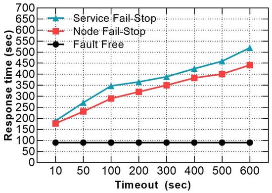 Figure 8 shows that the response times for both node and service fail-stop were remarkably decreased by 60% and 63.71%, respectively, in the case of 10 s timeout compared to the default value of 600 s. Although the optimal response time results incurred at the smallest timeout value, Hadoop recovery procedure took 171 s, 183 s to recover from node and service fail-stop, respectively, which is still very slow, as reported in Figure 9a,b. Moreover, if Hadoop detects the fault in a very short time, it needs a longer time for recovery, especially when the cluster runs on full resource capacity because the scheduler waits until allocating available slots to re-execute all the impacted tasks of the faulty node or service. Furthermore, reducing the timeout value for obtaining a rapid detection time is not an ideal option to achieve minimal response time penalties because a short timeout incurs a higher resource consumption [], due to the elevated messages’ exchange between the active processes in the cluster in a short frequency.