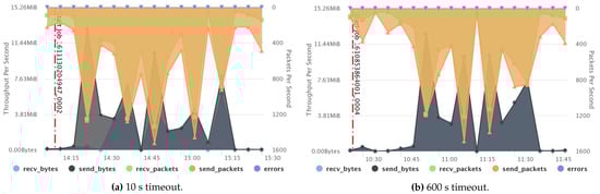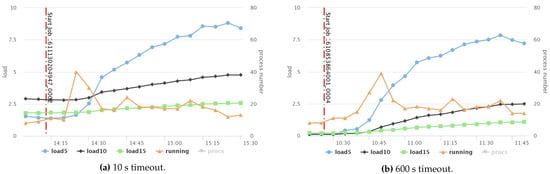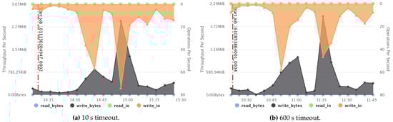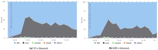 Figure 10a,b show a comparison of the CPU summary usage between two fault-free jobs that have two different timeout values: 10 s (small) and 600 s (default), respectively. The result reveals that the small timeout value incurred higher CPU usage than the default one. Likewise, network throughput, disk throughput, and the overall system load also acquired higher usage, as recorded in Figure 11, Figure 12 and Figure 13, respectively. However, short timeouts could be an acceptable approach for specific use cases when the application must comply with response time constraints and sacrifice resource consumption.