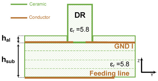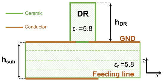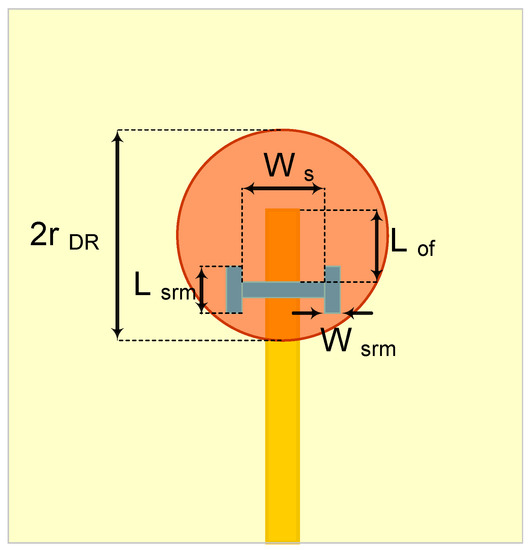 The conventional single element CDRA design consists of a cylindrical resonator, typically a high-dielectric ceramic [17,28], placed on top of the ground plane of a PCB substrate, typically made of organic material [17], with one of many different feeding mechanisms [17,28,31]. Here, we propose to follow the same procedure as the conventional design method, but using the LTCCs as both the ceramic of the cylindrical resonator and the grounded substrate on which it is placed. We further choose a feeding mechanism consisting of an inverted microstrip line that couples to the resonator through an aperture, of dogbone shape in the ground plane as illustrated by the side view in Figure 1 and the top schematic view in Figure 2. The design parameters consist of the substrate’s height, hsub, the resonator’s radius, rDR, and height, hDR, the feeding line’s width, wf, the dogbone slot’s dimensions, Ws, Lsrm, and Wsrm, and the off-set of the slot from the end of the feeding line, Lof.