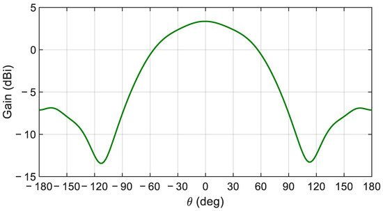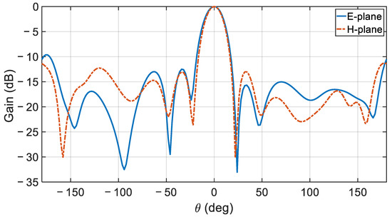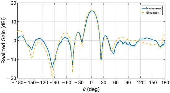 The simulated normalized gain profile of the proposed antenna array for the E- and H-planes at the center frequency is depicted in Figure 15. Figure 16 compares the simulated and measured realized gain pattern for the array at the measurement’s center frequency of 28.72 GHz. Overall, good agreement is observed at this frequency. The simulated 15.68 dBi and the measured 15.59 dBi gain values are virtually identical.