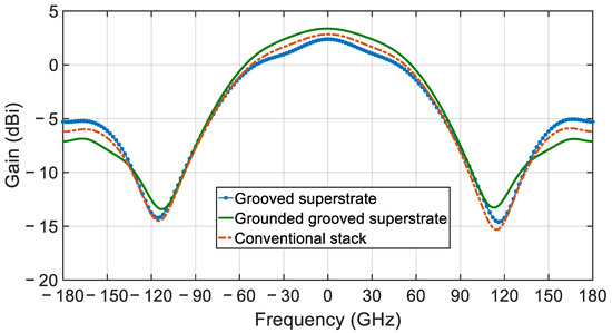 Comparison of the simulated gain profile for the single element CDRA for conventional, grooved superstrate and the grounded grooved superstrate stack.