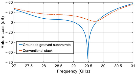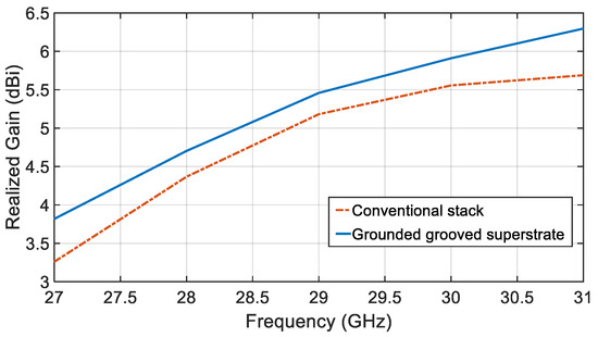 Figure 9 compares the realized gain variation over the considered frequency band of the proposed single element antenna for the convectional stack and the grounded and grooved superstrate.