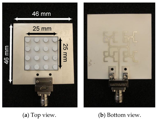 The designed antenna array, including the feeding network and the dielectric resonator pucks, have been fabricated with the same LTCC stack [35]. Figure 13 shows pictures of the top and bottom sides of the fabricated antenna array. To measure the array’s performance without the effects of the connector, a TRL (Through, Reflect, Line) calibration technique was used where the K-connector and a short section of the inverted microstrip line were used to build the three TRL kit standards. To ensure an accurate comparison between simulation and measurement results, the simulated data were de-embedded from the K-connector’s plane to the same plane of the reflect standard of the TRL kit.