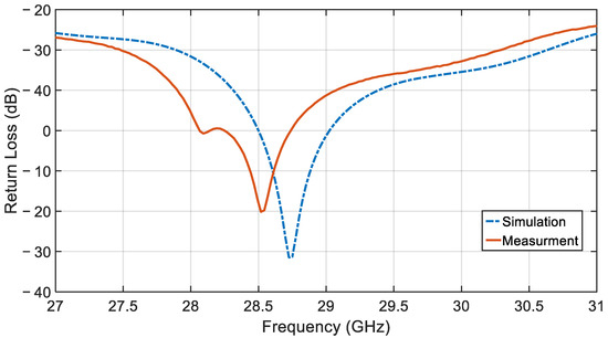 Figure 14 shows the simulated and measured results for the return loss of the array antenna. The measurement data have a slight frequency shift of ~0.2 GHz, compared to the simulation results, which may be due to minor imperfections during fabrication and/or a slight variation in the LTCC shrinkage during firing from the nominal values used in simulations. As shown, the measured 10 dB bandwidth of the antenna is 2.75 GHz, resulting in a fractional bandwidth of 9.81% around the resonant frequency of 28.52 GHz.