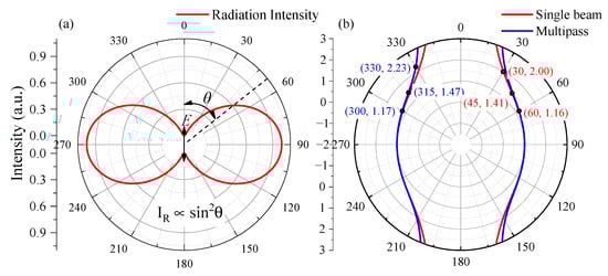 (a) Simulation result of angular distributions of the radiant intensity, IR; (b) simulation result of angular distributions of Raman scattering intensity with a single laser beam (red line) and multi-laser beam (blue line).