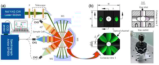 The detector of a Raman spectroscopy system includes either a charge-coupled device (CCD) [19] or a photomultiplier (PMT) [20]. The setup with a mounted CCD is able to detect multi-components simultaneously, and the detection cycle takes several minutes. The setup with a PMT exhibits a quick response (several seconds) and high sensitivity, although this system can only detect one component in one channel. It can be made to detect more components by adding channels. Most CERS systems use a mounted CCD to detect the Raman signal through one channel, and the radiation characteristics of the Raman scattering in this system are not yet clear.