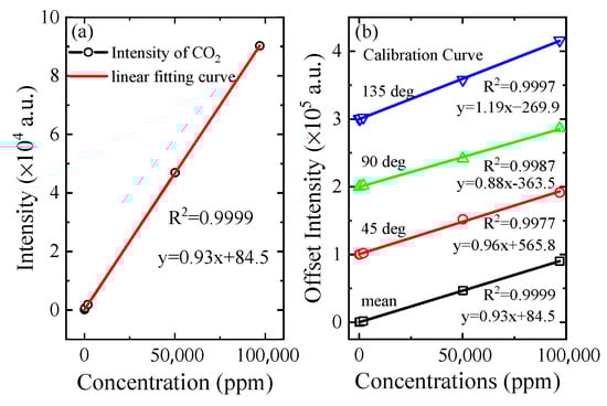 According to the relationship between the peak intensity of CO2 and its concentrations, the calibration curve is shown in Figure 5a. The hollow circles in that figure represent the peak intensity of CO2 at different concentrations, and the red line is a linear fitting curve. There is a good linear relationship between the peak intensities and the concentrations, and a correlation coefficient R2 = 0.9999. According to the 3σ standard, the standard deviation of the noise is 23.3, and the slope of the calibration curve is 0.93; the limit of detection (LOD) is 3σ/S = 75 ppm.