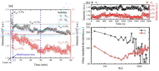 In order to evaluate the stability of this system, we carried out a one-hour measurement using channel 2. The experimental conditions were as follows: the sample was air, the integration time was 10 s and the number of accumulations was one. The peak intensities of N2 and O2 are shown in Figure 6. The stability of this system was equal to (Imax-Imin)/Iavg, in which Imax, Imin and Iavg are the maximum, minimum and average values, respectively. The measurement time could be divided into three parts. The first part was the time before 2.3 min, during which the stability of O2 and N2 were 4% and 3.3%, respectively. The second part was the time from 2.3 min to 30 min, during which the stability of O2 and N2 were 3.4% and 2.1%, respectively. The third part lasted from 30 min to 60 min, during which the stability of O2 and N2 were 1.5% and 1.4%, respectively. This stability was mainly related to the stability of the laser power (about 3%). Therefore, the final stability of the system could reach 1.5% after half an hour of warming up. In this case, we extracted the signals from 30 to 60 min to calculate the Allan standard deviation. Before that, the data from 30 to 60 min were removed the background, and the results of this process are shown in Figure 6b. Based on this, the Allan standard deviation was calculated, as shown in Figure 6c.