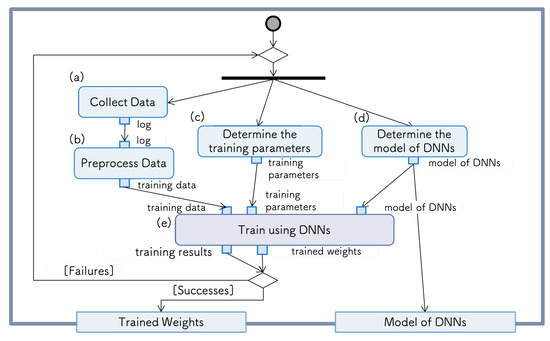 In the training function of the DNN (e), we retrieve the results using the training data, training parameters, and DNN model. The training parameters and model of the DNN are regarded as the tunable parameters (c,d) of the system. Based on the results, if the learning is judged to be successful, the weights of the trained DNN and its structure are passed to the next phase. In the case of learning failure, data must be recollected or the training parameters and structure of the DNN model must be re-selected.