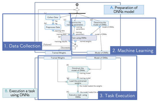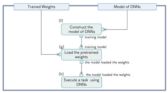 As each process of R&D for a DNN is at the general system level, we must configure the system architecture at the human activity level by combining the packages. Therefore, we constructed the system flow with the three steps: DC, ML, and TE. The correspondence between the functions (a)–(h) and these steps is illustrated in Figure 3. The execution of a task using a DNN and the preparation of the DNN model described in the previous section are connected by the model configuration and the weight parameter passing part. Furthermore, the preparation of the DNN model is divided into the DC and ML steps.