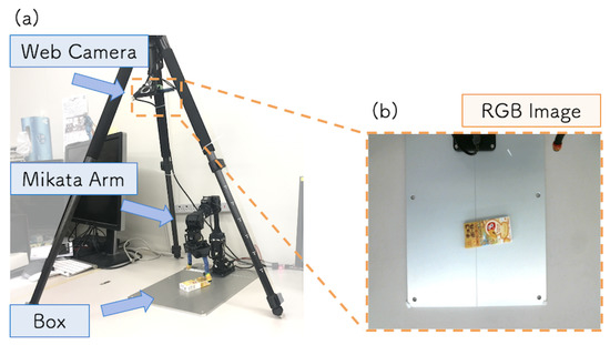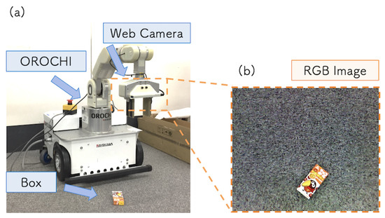 To address this issue, we adopted depth information as additional input from the sensor. As the RGB+depth (RGB-D) camera, we used RealSense r200 [42]. To control the RealSense r200, we replaced the WebCameraRTC with RealSense3D [43] and added depth information to the input. We extended the DNN to estimate the position and orientation of the object from the RGB camera image and depth image. Depth information was acquired as a matrix of the same size as the RGB image, and the input image to DNN was pixels. Figure 13b,c show the examples of RGB image and depth image collected at the DC step. Other experimental settings were the same as described in Section 5.2.