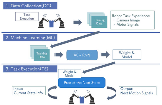 End-to-end robot motion learning is currently being studied as a promising approach to perform difficult robot tasks, such as manipulating flexible objects [3,44]. Although we used DNNs only for the recognition part, Refs. [3,44] used two DNNs, an autoencoder (AE) for feature extraction and a recurrent neural network (RNN) for motion learning. First, they trained the AE for extracting low-dimensional image features that represent the relationship between the object and robot arm in task manipulation from high-dimensional raw images. Then, they trained the RNN to estimate the next motion based on the previous image and robot state. By iterating these processes, the system can generate appropriate motions for the robot to perform its task online. To realize this system, we extended the educational kit by modifying the DC, ML, and TE steps.