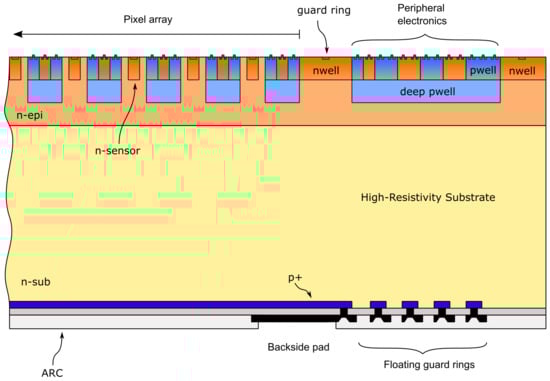 A schematic cross-section of the proposed sensor including the backside termination structures is shown in Figure 1. The collection electrodes, produced using standard nwell implantations, are located on an n-type epitaxial layer that was grown on top of a high-resistivity (2 k Ω × cm) n-type substrate. The pixel array is surrounded by an n-type guard ring that can be biased to shield the pixels from the current components generated in the surrounding regions. Deep pwells are implanted on the sensor frontside around the collection electrodes and on the array periphery below the nwells and pwells where the in-pixel and peripheral CMOS circuits are hosted. The sensor p–n junction and the floating guard rings, which protect the junction from early edge breakdown, are realized on the wafer backside with implantations. A passivation layer is present at the backside surface to protect the floating guard rings, which are equipped with a metal field plate to mitigate the peaks of the electric field at the junctions [].