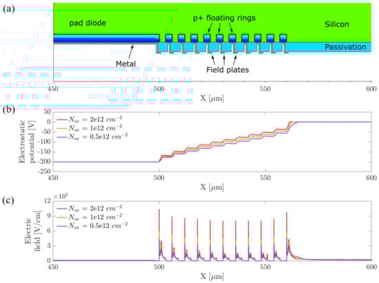 The two graphs reported in Figure 2b,c represent the electrostatic potential and the electric field along a horizontal cut-line near the backside surface for three different oxide charge concentrations with an applied bias of 200 V. The first plot shows a step-like behavior with an increasing potential difference between the guard rings that are farther from the junction region. Relevant electric field peaks can be observed in the second plot at the p–n junction end and at the guard ring boundaries, and a clear correlation between the amplitude of the electric field peaks and the concentration of oxide charges can be noticed. A double peak is present in correspondence to each guard ring with the first peak located at the boundary of the guard ring junction and the second one at the field plate end.