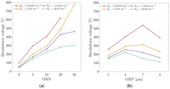 (a) Breakdown voltage as a function of the number of guard rings (GRN) for different concentrations of charges in the passivation layer (). The results refer to simulations with guard ring pitch equal to 6 μm. (b) Breakdown voltage as a function of the guard ring pitch (GRP) for different concentrations of charges in the passivation layer (). The results refer to simulations with 10 guard rings.