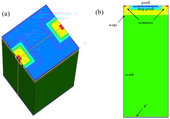 (a) 3D domain composed by two pixel halves. The red and blue regions represent the pixel nwells and pwell, respectively. The boundary of the depletion region is marked with white lines. The dashed orange lines represent the edges of the cross section cut plane. (b) 2D cross-section (Not to scale).