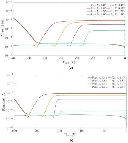 (a) Pixel nwell and backside implant I–V curves as a function of for a substrate thickness of 100 μm. (b) Pixel nwell and backside implant I–V curves as a function of for a substrate thickness of 300 μm.