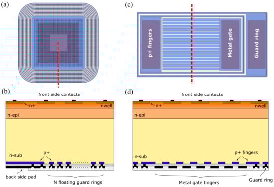 The test structures include pixel arrays with integrated electronics and 50 μm pixel pitch and passive test structures made of pixel arrays with 50 μm and 25 μm pitch, having all the sensor nodes connected in parallel to a common metal pad. In addition to active and passive pixel arrays, several test structures have been designed to qualify the characteristics of the backside layers and of the termination structures. More specifically, a set of backside /n-substrate diodes with different number of guard rings and pitches, designed according to the results of TCAD simulations, were included as control structures in the first fabrication run, together with a MOS capacitor and a gated diode. Figure 6a,c show the simplified layouts of a backside diode with 10 floating guard rings and of a gated diode, while Figure 6b,d represent the schematic cross sections of the same structures shown in correspondence to the cut planes marked with the dashed red lines.
