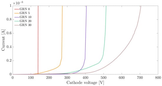 Test diode currents as a function of the applied cathode voltage measured on diodes with different number of guard rings (GRN) and 6 μm pitch.