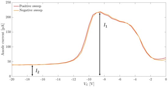 We performed a set of measurements on gate-controlled diodes in order to extract the value of the surface generation velocity at the interface between silicon and the backside passivation layer, which is related to the surface component of the diode leakage current. The measurements were carried out following the procedure explained in [,]. A negative constant voltage equal to 5 V was applied to the diode cathode to reverse-bias the region near the backside surface. A voltage sweep was applied to the diode gate to bring the devices from accumulation to strong inversion and the other way around, and the diode current was acquired as a function of the applied gate voltage .