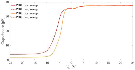 The C–V curves of the MOS capacitors were measured using an AC probe signal with 10 kHz frequency and 100 mV amplitude. The C–V curves obtained from two samples belonging to different wafers are shown in Figure 9, where the continuous and dashed lines represent the C–V curves, which were measured sweeping the bias voltage from strong inversion to accumulation and the other way around.
