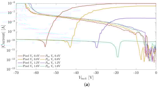 Figure 5a,b show the I–V curves of a pixel nwell and of the backside implant for different voltages applied to the frontside nwell and for two different substrate thicknesses 100 and 300 μm. The dip in the curve, corresponding to the change of sign in the pixel current, was chosen as reference for the extraction of the full depletion voltage. Since the presence of a small punch-through current density can be tolerated and does not compromise the operation of the detector, the upper limit for the bias voltage range was chosen as the point where the backside current exceeds a certain threshold value of A/μm2, chosen accordingly to the acceptable power dissipation. It can be observed that the operating range can be extended by increasing the voltage applied to the sensor nodes, and an applied voltage of 0.8 V is sufficient to provide a depletion voltage significantly smaller than the onset of punch-through currents. On the contrary, the current measured at the backside implant electrode shows no dependency on the applied .