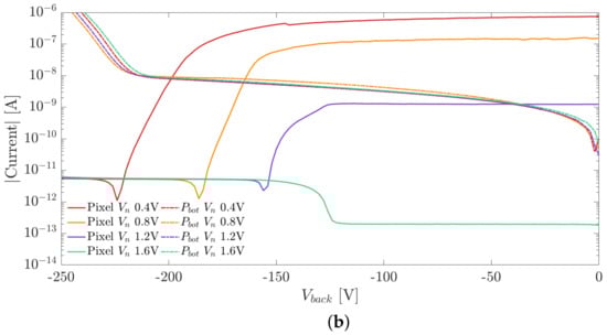 Figure 10a,b show the I–V curves measured at the pixel nwell and at the backside p-electrode for two samples with different substrate thicknesses. We employed the method explained in Section 2 for the extraction of the full depletion voltage. The curve plateau, which follows the dip marking the onset of the full depletion, represents the pixel leakage current.