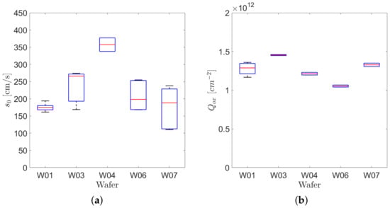 (a) Box plot of the surface generation velocities measured on different wafers. (b) Box plot of the concentration of charges in the surface passivation layer measured on different wafers.