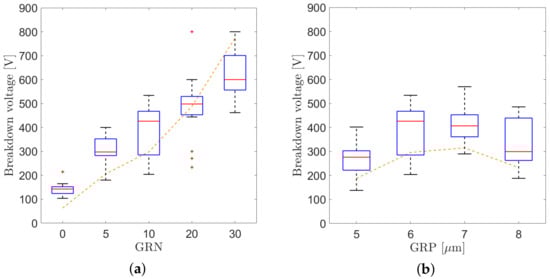 The breakdown voltages extracted from the I–V curves measured on the test diodes are reported in two different box plots (Figure 12a,b), where the x-axes represent the number of guard rings and the guard ring pitch, respectively. The maximum and minimum values, the median, the interquartile range, and the outliers are shown in the box plots. The results extracted from a total of 22 devices from seven wafers are plotted on the same graph, and the breakdown voltages obtained from the simulations with Nox equal to 1 × 1012 cm−2 are reported for comparison with the dashed orange lines. We noticed no significant differences in the breakdown voltages extracted from devices on different wafers.