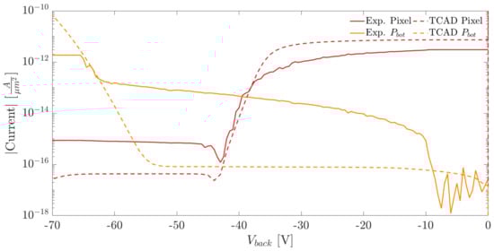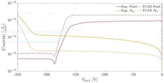 Comparing the I–V curves measured at the pixel nodes (red lines) in Figure 13 and Figure 14, it can be observed that the measured and simulated values of the full depletion voltage are in excellent agreement. On the contrary, in both plots, the intensity of the current flowing at the backside electrode is significantly larger than the simulated one. As mentioned in Section 3, the higher currents obtained experimentally are due to thermal generation at the diced lateral chip surface.